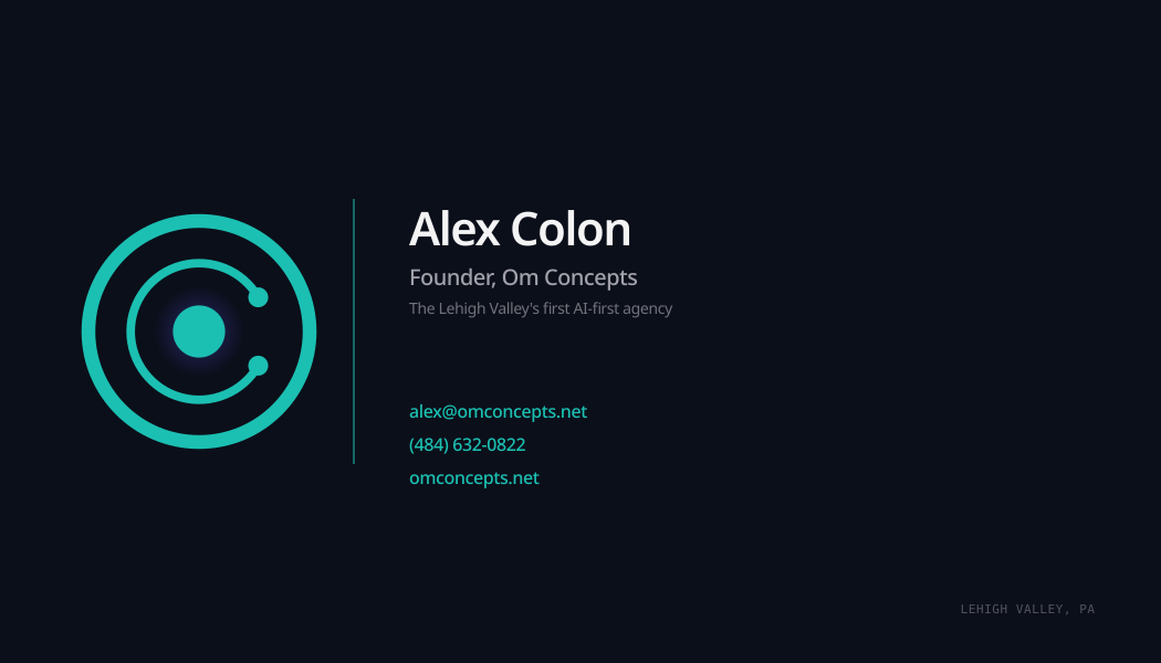 All documentation lives under docs/reference/ in the site's repository. For questions or co-branding requests, email alex@omconcepts.net.